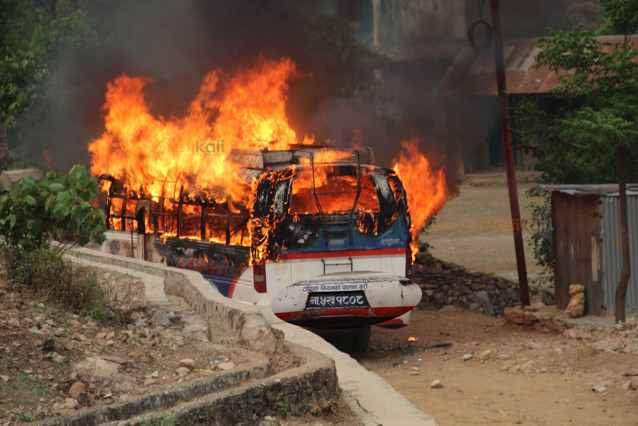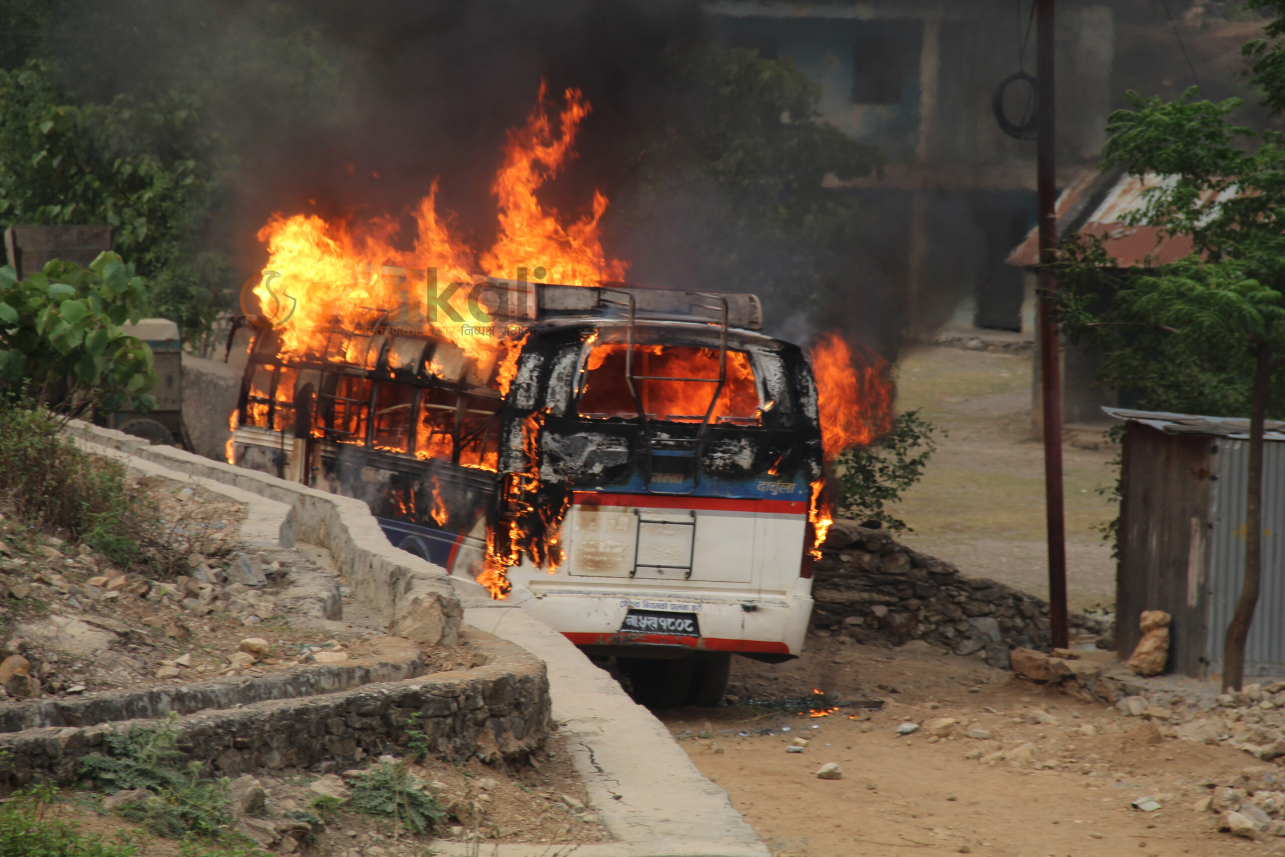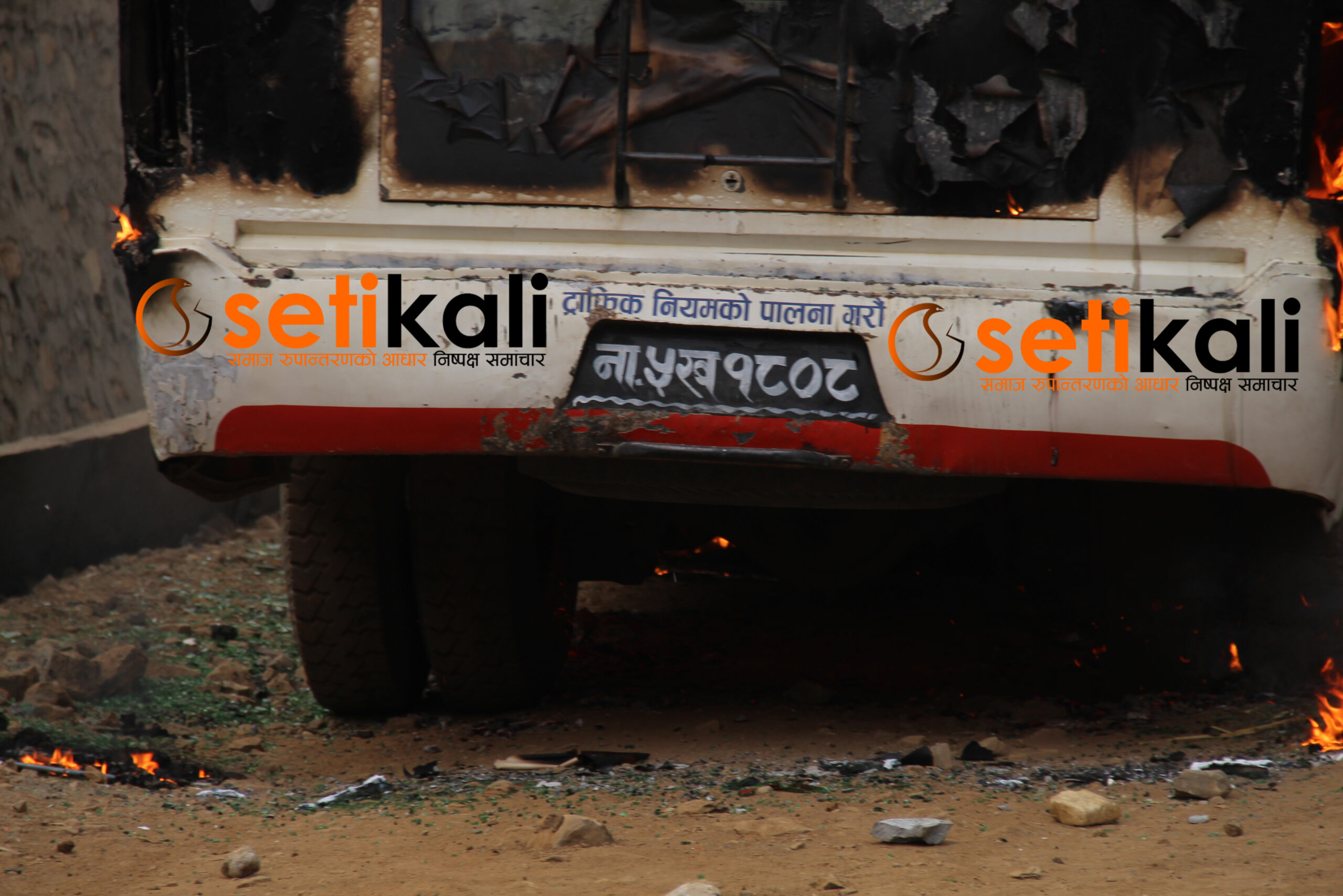 बालकको घटनास्थलमै मृत्यभएपछि आक्रोशित स्थानीयले बस जलाएका छन्भने बसका सहचालक दिपक जोशीलाई समेत सख्त घाइते हुने गरी कुटेका छन् ।