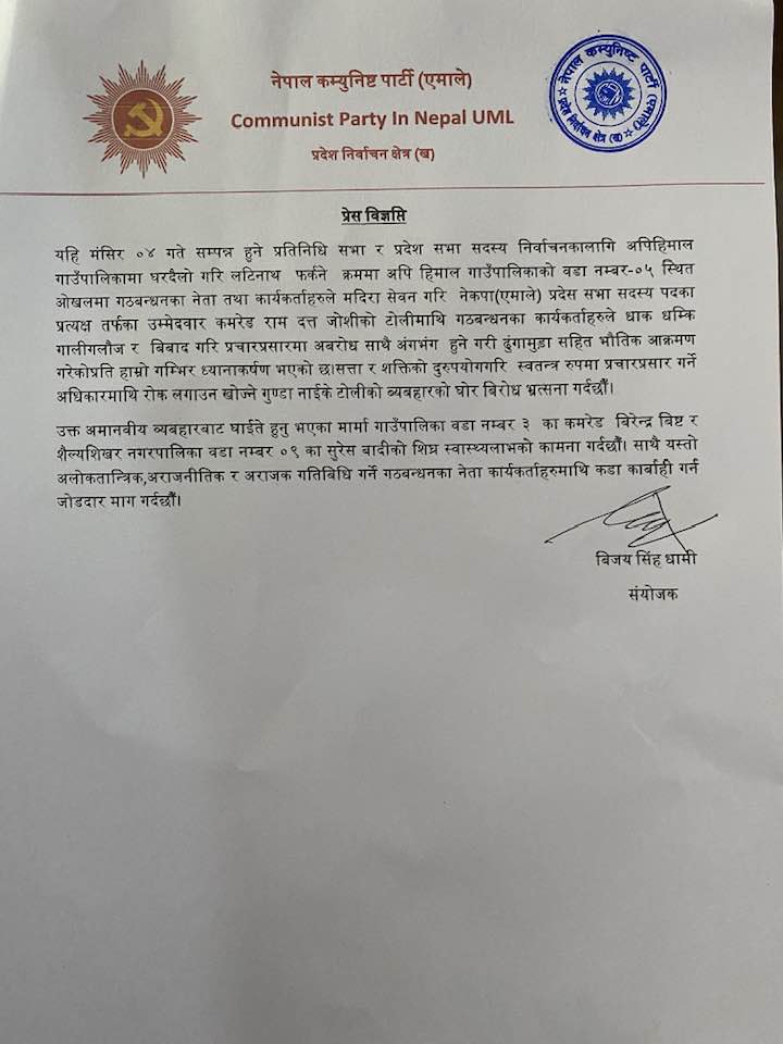 नेकपा एमाले दार्चुला र नेकपा एमाले शैल्यशिखर नगर कमिटील विज्ञप्तीजारी गर्दै चुनावको समयमा उम्मेदवारमाथि हुने घट्ना नदोहोर्याउन चेतावनी दिएको छ ।