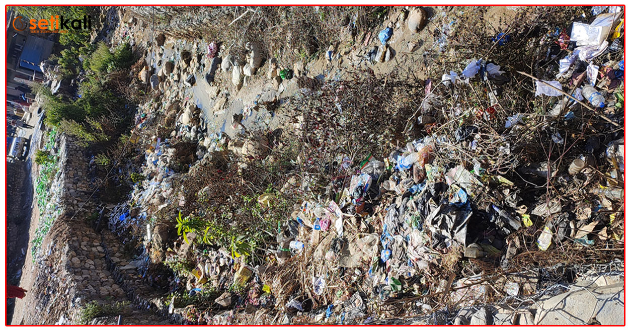 शैल्यशिखर नगरपालिका –९ गोकुलेश्वर बजार क्षेत्रमा थुप्रिएको कुहिने र नकुहिने फोहोर खुलेआम बजार,चमेलिया पुलको बिचमा,सडक र नदी, खोलाको छेउमा जथाभावी फालिएको छ ।