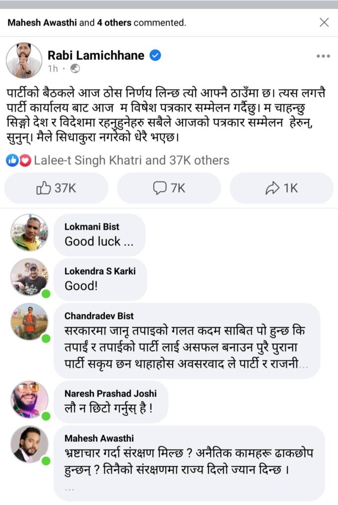 पार्टी कार्यालय बाट आज म विषेश पत्रकार सम्मेलन गर्दैछु । म चाहन्छु सिङ्गो देश विदेशमा रहनुहुनेहरु सबैले आजको पत्रकार सम्मेलन हेरुन्, सुनुन्।’ लेखेका छन्