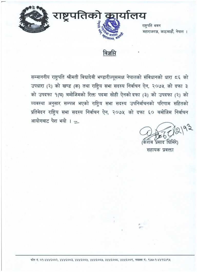 सहप्रवक्ता घिमिरेद्वारा जारी विज्ञप्तिमा भनिएको छ, ‘धारा ८६ को उपधारा (२) को खण्ड (क) तथा राष्ट्रिय सभा सदस्य निर्वाचन ऐन, २०७५ को दफा ३ को उपदफा १(घ)बमोजिमको रिक्त पदमा सोही ऐनको दफा (३) को उपदफा (२) को व्यवस्था अनुसार सम्पन्न भएको राष्ट्रिय सभा सदस्य उपनिर्वाचनको परिणाम सहितको प्रतिवेदन राष्ट्रिय सभा सदस्य निर्वाचन ऐन, २०७५ को दफा ६० बमोजिम निर्वाचन आयोगबाट पेश भयो ।’यही जेठ ६ गते भएको उपनिर्वाचन (बागमती प्रदेशमा) डा.खिमलाल देवकोटा विजयी भएका थिए ।