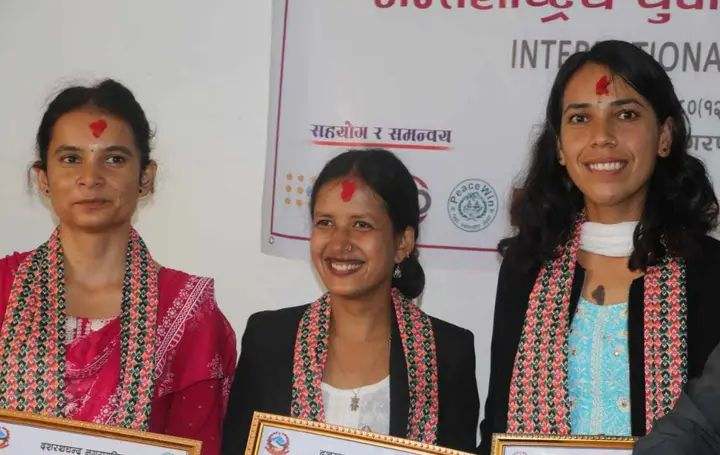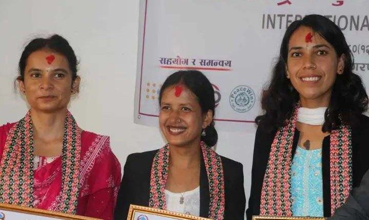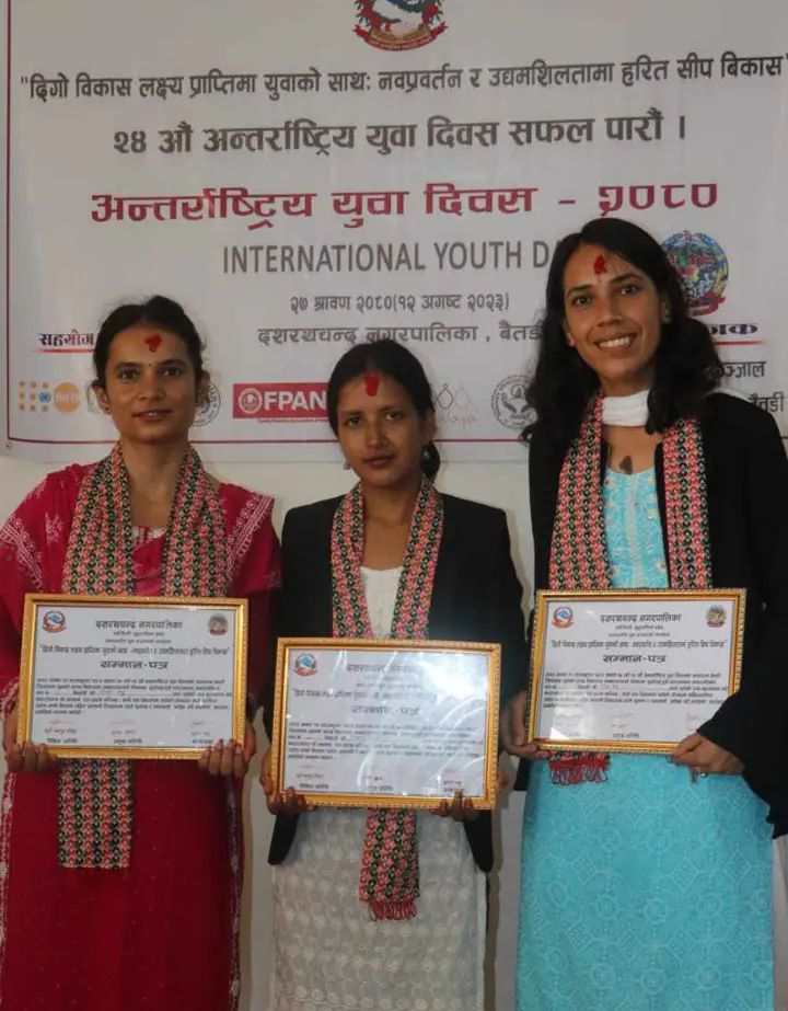 दशरथचन्द नगरपालिकास्तरीय युवा सञ्जालको आयोजनामा भएको कार्यक्रममा दशरथचन्द नगरपालिका १ की निर्मला टेर, दशरथचन्द नगरपालिका २ की रेजिना टेलर र दशरथचन्द नगरपालिका ४ की निशा भट्टलाई प्रशांसा पत्र सहित सम्मानित गरिएको हो ।